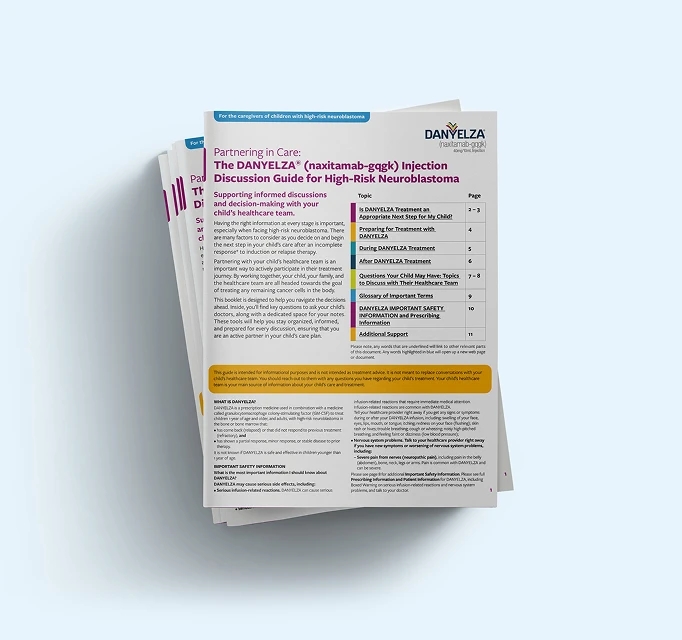 Only with DANYELZA does your child’s care team have the flexibility to decide where the infusion is given. DANYELZA can be given in an or inpatient setting. In clinical trials, most patients were given DANYELZA in an outpatient setting, and many children were able to go home the same day. Talk to your care team about whether this may be a possibility for your child.